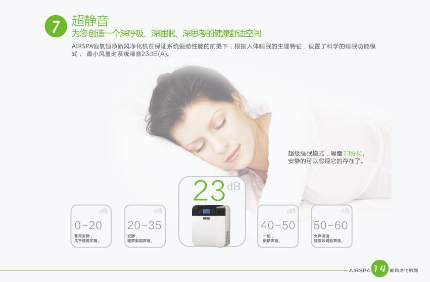 AIRSPA恒氧恒凈新風凈化機在保證系統(tǒng)強勁性能的前提下、根據(jù)人體睡眠的生理特征、設置了科學的睡眠功能模式,在此模式下、系統(tǒng)噪音最低只有23Db(A)