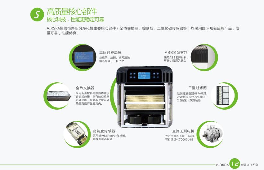 AIRSPA恒氧恒凈新風凈化機主要核心部件(全熱交換芯、控制板、二氧化碳傳感器等)均采用國際知名品牌產(chǎn)品、質量可靠、性能優(yōu)良。